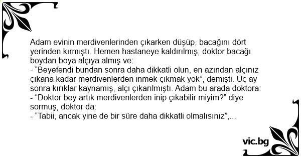 - “Beyefendi bundan sonra daha dikkatli olun, en azından alçınız çıkana kadar merdivenlerden inmek çıkmak yok”, demişti. Üç ay sonra kırıklar kaynamış, alçı çıkarılmıştı. Adam bu arada doktora: