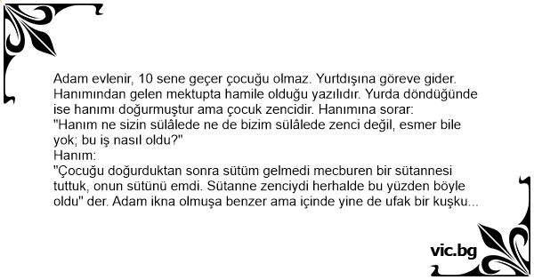 Adam evlenir, 10 sene geçer çocuğu olmaz. Yurtdışına göreve gider. Hanımından gelen mektupta hamile olduğu yazılıdır. Yurda döndüğünde ise hanımı doğurmuştur ama çocuk zencidir. Hanımına sorar: