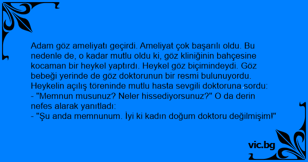 Adam göz ameliyatı geçirdi. Ameliyat çok başarılı oldu. Bu nedenle de, o kadar mutlu oldu ki, göz kliniğinin bahçesine kocaman bir heykel yaptırdı. Heykel göz biçimindeydi. Göz bebeği yerinde de göz doktorunun bir resmi bulunuyordu. Heykelin açılış töreninde mutlu hasta sevgili doktoruna sordu:
