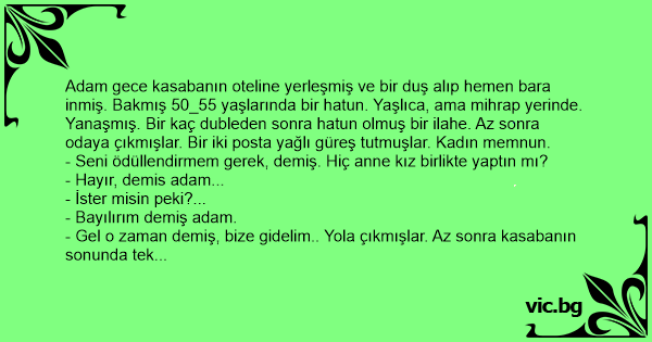 Adam gece kasabanın oteline yerleşmiş ve bir duş alıp hemen bara inmiş. Bakmış 50_55 yaşlarında bir hatun. Yaşlıca, ama mihrap yerinde. Yanaşmış. Bir kaç dubleden sonra hatun olmuş bir ilahe. Az sonra odaya çıkmışlar. Bir iki posta yağlı güreş tutmuşlar. Kadın memnun.