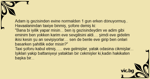 "Bana bi iyilik yapar misin... ben iş gezisindeydim ve adim gibi eminim ben yokken karim eve sevgilisini aldi.... şimdi eve gidelim ikisi kesin şu an sevişiyorlar.... sen de benle eve girip ben onlari basarken şahitlik eder misin?"