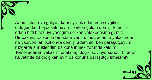 Bir bakmış balkonda bir adam var. Tutmuş adamın yakasından ne yapıyon lan bolkonda demiş. adam abi ben paraşütçüyüm rüzgarda sürüklendim balkona inmek zorunda kaldım.