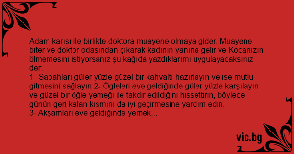 - "Eger bu dediklerimi harfiyyen uygularsanız kocanızın sağlık yönünden hiçbir problemi olmayacak" der doktor.
