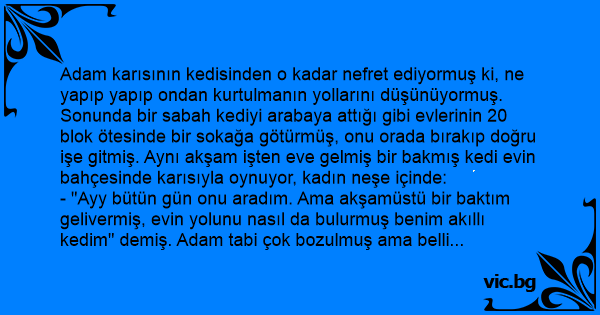 Adam karısının kedisinden o kadar nefret ediyormuş ki, ne yapıp yapıp ondan kurtulmanın yollarını düşünüyormuş. Sonunda bir sabah kediyi arabaya attığı gibi evlerinin 20 blok ötesinde bir sokağa götürmüş, onu orada bırakıp doğru işe gitmiş. Aynı akşam işten eve gelmiş bir bakmış kedi evin bahçesinde karısıyla oynuyor, kadın neşe içinde: