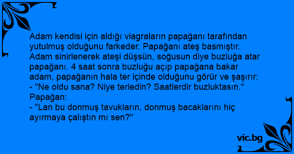Adam kendisi için aldığı viagraların papağanı tarafından yutulmuş olduğunu farkeder. Papağanı ateş basmıştır. Adam sinirlenerek ateşi düşsün, soğusun diye buzluğa atar papağanı. 4 saat sonra buzluğu açıp papağana bakar adam, papağanın hala ter içinde olduğunu görür ve şaşırır: