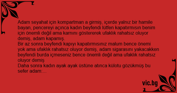 Adam seyahat için kompartman a girmiş, içerde yalnız bir hamile bayan, pencereyi açınca kadın beyfendi lütfen kapatırmısın benim için önemli değil ama karnını göstererek ufaklık rahatsız oluyor demiş, adam kapamış.