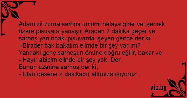 Adam zil zurna sarhoş umumi helaya girer ve işemek üzere pisuvara yanaşır. Aradan 2 dakika geçer ve sarhoş yanındaki pisuvarda işeyen gence der ki;
