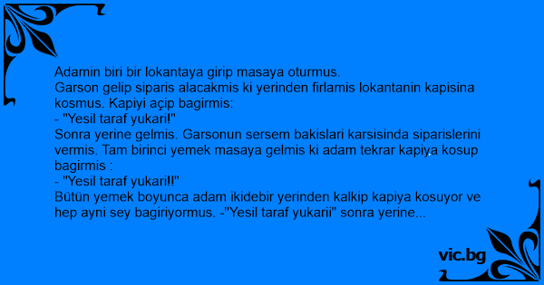 Garson gelip siparis alacakmis ki yerinden firlamis lokantanin kapisina kosmus. Kapiyi açip bagirmis: