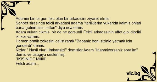 Sohbet sirasinda felcli arkadasi adama "terliklerim yukarida kalmis onlari bana getirirmisin lutfen" diye rica etmis.