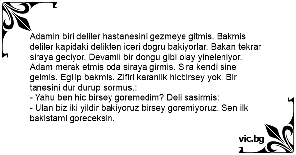 Adamin biri deliler hastanesini gezmeye gitmis. Bakmis deliler kapidaki delikten iceri dogru bakiyorlar. Bakan tekrar siraya geciyor. Devamli bir dongu gibi olay yineleniyor. Adam merak etmis oda siraya girmis. Sira kendi sine gelmis. Egilip bakmis. Zifiri karanlik hicbirsey yok. Bir tanesini dur durup sormus.:
