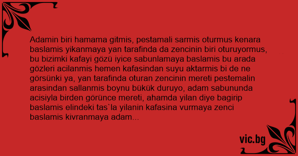 Adamin biri hamama gitmis, pestamali sarmis oturmus kenara baslamis yikanmaya yan tarafinda da zencinin biri oturuyormus, bu bizimki kafayi gözü iyice sabunlamaya baslamis bu arada gözleri acilanmis hemen kafasindan suyu aktarmis bi de ne görsünki ya, yan tarafinda oturan zencinin mereti pestemalin arasindan sallanmis boynu bükük duruyo, adam sabununda acisiyla birden görünce mereti, ahamda yilan diye bagirip baslamis elindeki tas`la yilanin kafasina vurmaya zenci baslamis kivranmaya adam tabiki can havliyle disari kendini zor ati vermis, adama sormuslar disarida ne oluyo ne bu soluk soluga ciktin disari diye ; adam, ya iceri yilan girmis son anda fark ettim bi iki tane vurdumda fayda etmedi herhalde bende bisey yokta herhalde yanimda zenci vardi onu soktu herhalde adam cagiz yerde kivraniyordu demis...