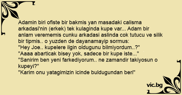 Adamin biri ofiste bir bakmis yan masadaki calisma arkadasi'nin (erkek) tek kulaginda kupe var... Adam bir anlam verememis cunku arkadasi aslinda сок tutucu ve silik bir tipmis.. o yuzden de dayanamayip sormus: