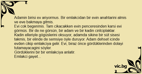 Evi сок begenmis. Tam cikacakken evin penceresinden karsi evi görmüs. Bir de ne görsün, bir adam ve bir kadin cirilciplaklar.