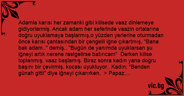Adamla karısı her zamanki gibi kilisede vaaz dinlemeye gidiyorlarmiş. Ancak adam her seferinde vaazin ortalarına doğru uyuklamaya başlarmış,o yüzden yerlerine oturmadan önce karısı çantasından bir çengelli iğne çıkartmış, "Bana bak adam.." demiş.. "Bugün de yanımda uyuklarsan şu iğneyi artık nerene rastgelirse batırıcam" Derken kilise toplanmış, vaaz başlamış. Biraz sonra kadın yana doğru başını bir çevirmiş, kocası uyukluyor.. Kadın; "Benden günah gitti" diye iğneyi çıkarırken, > Papaz; "BU EVRENİ YARATAN KİMDİR?" diye sormuş. Tam o anda kadın iğneyi batırıverince adam; "TANRIMMM" diye bağırmış.. Papaz gülümsemiş, "Adamı uyandırdım" diye kadın da gülümsemiş.. Vaaz devam etmiş.. 5_10 dakika sonra kadın yine başını çevirmiş, adam yine uyukluyor... Bu arada vaaz devam ediyor.. Papaz; "Allah'in sizi duyması için ona şöyle seslenmeniz yeter" derken, kadın yine adama igneyi > batırınca,adam; "EY YÜCE TANRIM!!" diye bağırmış.. Papaz yine onlara bakıp gülümsemiş, vaaz devam etmiş...5_10 dakika sonra kadın kocasına bakmış,adamın yine uyukladığını görünce;"Pes yani pes" diye iğnesini çıkartmış.. Papaz da bu sırada ; ". Peki Havva ikinci kez hamile kaldığı zaman Adem'e ne demiştir? "diye sorarken kadın bütün gücüyle iğneyi adama batırmış ve adam can havliyle bağırmış:
