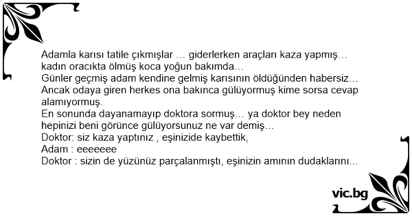 Adamla karısı tatile çıkmışlar … giderlerken araçları kaza yapmış…kadın oracıkta ölmüş koca yoğun bakımda…