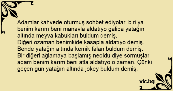 Adamlar kahvede oturmuş sohbet ediyolar. biri ya benim karım beni manavla aldatıyo galiba yatağın altında meyva kabukları buldum demiş.