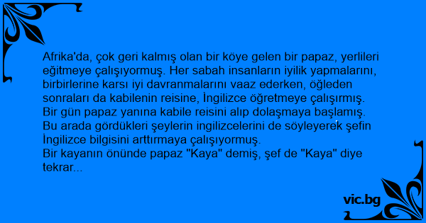 Bir gün papaz yanına kabile reisini alıp dolaşmaya başlamış. Bu arada gördükleri şeylerin ingilizcelerini de söyleyerek şefin İngilizce bilgisini arttırmaya çalışıyormuş.