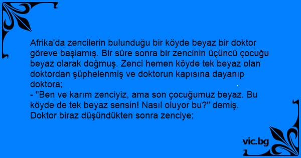 - "Ben ve karım zenciyiz, ama son çocuğumuz beyaz. Bu köyde de tek beyaz sensin! Nasıl oluyor bu?" demiş.