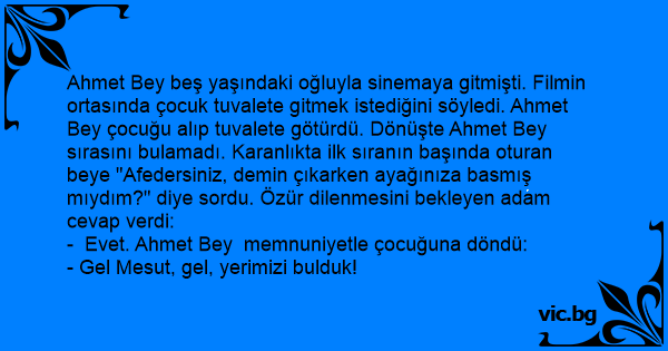 Ahmet Bey beş yaşındaki oğluyla sinemaya gitmişti. Filmin ortasında çocuk tuvalete gitmek istediğini söyledi. Ahmet Bey çocuğu alıp tuvalete götürdü. Dönüşte Ahmet Bey sırasını bulamadı. Karanlıkta ilk sıranın başında oturan beye "Afedersiniz, demin çıkarken ayağınıza basmış mıydım?" diye sordu. Özür dilenmesini bekleyen adam cevap verdi: