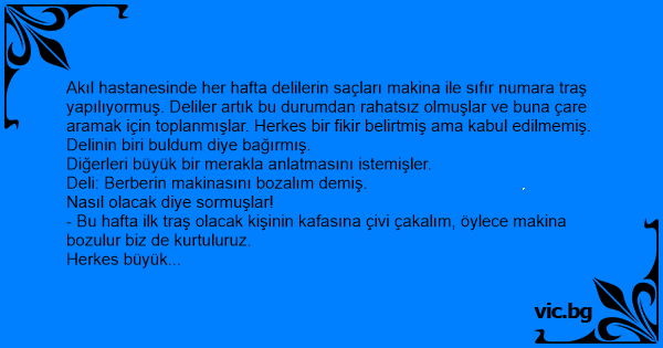 Akıl hastanesinde her hafta delilerin saçları makina ile sıfır numara traş yapılıyormuş. Deliler artık bu durumdan rahatsız olmuşlar ve buna çare aramak için toplanmışlar. Herkes bir fikir belirtmiş ama kabul edilmemiş.