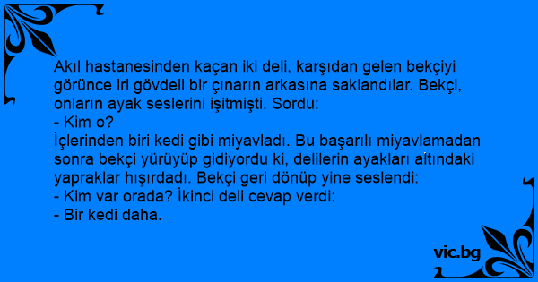 Akıl hastanesinden kaçan iki deli, karşıdan gelen bekçiyi görünce iri gövdeli bir çınarın arkasına saklandılar. Bekçi, onların ayak seslerini işitmişti. Sordu: