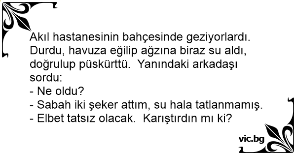 Akıl hastanesinin bahçesinde geziyorlardı. Durdu, havuza eğilip ağzına biraz su aldı, doğrulup püskürttü. Yanındaki arkadaşı sordu: