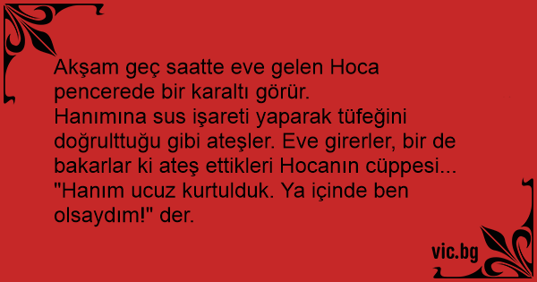Hanımına sus işareti yaparak tüfeğini doğrulttuğu gibi ateşler. Eve girerler, bir de bakarlar ki ateş ettikleri Hocanın cüppesi... "Hanım ucuz kurtulduk. Ya içinde ben olsaydım!" der.