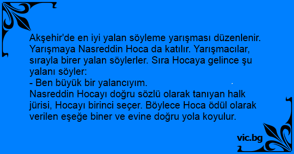 Akşehir'de en iyi yalan söyleme yarışması düzenlenir. Yarışmaya Nasreddin Hoca da katılır. Yarışmacılar, sırayla birer yalan söylerler. Sıra Hocaya gelince şu yalanı söyler: