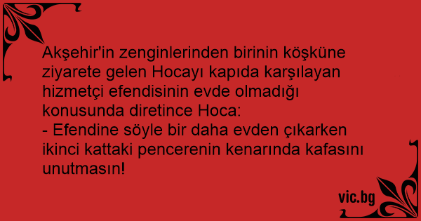 Akşehir'in zenginlerinden birinin köşküne ziyarete gelen Hocayı kapıda karşılayan hizmetçi efendisinin evde olmadığı konusunda diretince Hoca: