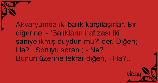 Akvaryumda iki balık karşılaşırlar. Biri diğerine; - 'Balıkların hafızası iki saniyelikmiş duydun mu?' der. Diğeri; - Ha?.. Soruyu soran ; - Ne?..
