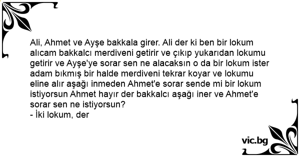 Ali, Ahmet ve Ayşe bakkala girer. Ali der ki ben bir lokum alıcam bakkalcı merdiveni getirir ve çıkıp yukarıdan lokumu getirir ve Ayşe'ye sorar sen ne alacaksın o da bir lokum ister adam bıkmış bir halde merdiveni tekrar koyar ve lokumu eline alır aşağı inmeden Ahmet'e sorar sende mi bir lokum istiyorsun Ahmet hayır der bakkalcı aşağı iner ve Ahmet'e sorar sen ne istiyorsun?