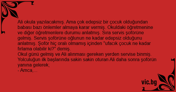 Okul günü gelmiş ve Ali alınması gereken yerden servise binmiş. Yolculuğun ilk başlarında sakin sakin oturan Ali daha sonra şoförün yanına gelerek;