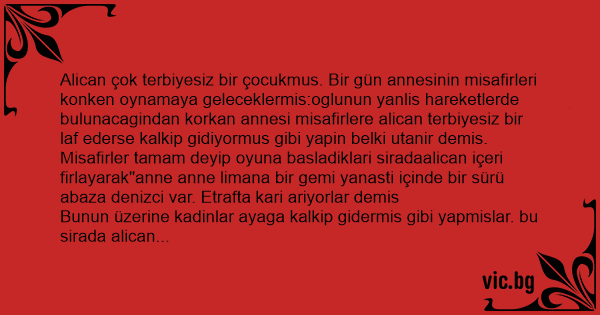 Alican çok terbiyesiz bir çocukmus. Bir gün annesinin misafirleri konken oynamaya geleceklermis:oglunun yanlis hareketlerde bulunacagindan korkan annesi misafirlere alican terbiyesiz bir laf ederse kalkip gidiyormus gibi yapin belki utanir demis. Misafirler tamam deyip oyuna basladiklari siradaalican içeri firlayarak"anne anne limana bir gemi yanasti içinde bir sürü abaza denizci var. Etrafta kari ariyorlar demis