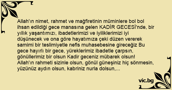 Allah'ın nimet, rahmet ve mağfiretinin müminlere bol bol ihsan edildiği gece manasına gelen KADİR GECESİ'nde, bir yıllık yaşantımızı, ibadetlerimizi ve iyiliklerimizi iyi düşünecek ve ona göre hayatımıza çeki düzen vererek samimi bir teslimiyetle nefis muhasebesine gireceğiz Bu gece hayırlı bir gece, yüreklerimiz ibadetle çarpsın, gönüllerimiz bir olsun Kadir geceniz mübarek olsun!