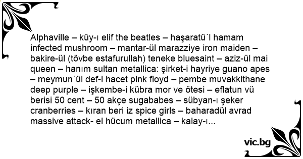 Alphaville – kûy-ı elif the beatles – haşaratü´l hamam infected mushroom – mantar-ül marazziye iron maiden – bakire-ül (tövbe estafurullah) teneke bluesaint – aziz-ül mai queen – hanım sultan metallica: şirket-i hayriye guano apes – meymun´ül def-i hacet pink floyd – pembe muvakkithane deep purple – işkembe-i kübra mor ve ötesi – eflatun vü berisi 50 cent – 50 akçe sugababes – sübyan-ı şeker cranberries – kıran beri iz spice girls – baharadül avrad massive attack- el hücum metallica – kalay-ı hümayun red hot chili pePpers – densiz beynamaz nebat hepsi – topyek´un mfö – Malumat-ı Füruş Örfen destiny´s child – velet-ül mukadderat abba – elifbabaelif bulutsuzluk özlemi – el insaf ya nejad alcatrazz – mekan-i zindan manga – cüdded-ü aksa-i şark kim bunlar – merak-ül beşer