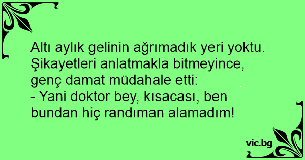 Altı aylık gelinin ağrımadık yeri yoktu. Şikayetleri anlatmakla bitmeyince, genç damat müdahale etti: