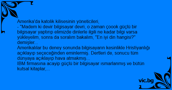- "Madem ki devir bilgisayar devri, o zaman çoook güçlü bir bilgisayar yaptırıp elimizde dinlerle ilgili ne kadar bilgi varsa yükleyelim, sonra da soralım bakalım, "En iyi din hangisi?" demişler...