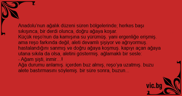 Ağa durumu anlamış. içerden buz almış, reşo’ya uzatmış. buzu alete bastırmasını söylemiş. bir süre sonra, buzun etkisiyle ağrı ve şişlik kalmamış.