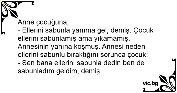 Anne çocuğuna; - Ellerini sabunla yanıma gel, demiş. Çocuk ellerini sabunlamış ama yıkamamış. Annesinin yanına koşmuş. Annesi neden ellerini sabunlu bıraktığını sorunca çocuk: - Sen bana ellerini sabunla dedin ben de sabunladım geldim, demiş.