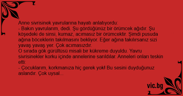 - Bakın yavrularım, dedi. Şu gördüğünüz bir örümcek ağıdır. Şu köşedeki de sinsi, kurnaz, acımasız bir örümcektir. Şimdi pusuda ağına böceklerin takılmasını bekliyor. Eğer ağına takılırsanız sizi yavaş yavaş yer. Çok acımasızdır.