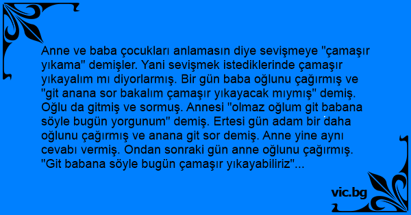 Anne ve baba çocukları anlamasın diye sevişmeye "çamaşır yıkama" demişler. Yani sevişmek istediklerinde çamaşır yıkayalım mı diyorlarmış. Bir gün baba oğlunu çağırmış ve "giт anana sor bakalım çamaşır yıkayacak mıymış" demiş. Oğlu da gitmiş ve sormuş. Annesi "olmaz oğlum giт babana söyle bugün yorgunum" demiş. Ertesi gün adam bir daha oğlunu çağırmış ve anana giт sor demiş. Anne yine aynı cevabı vermiş. Ondan sonraki gün anne oğlunu çağırmış. "Giт babana söyle bugün çamaşır yıkayabiliriz" demiş. Oğulda gitmiş babasına sormuş. Babası "yok oğlum olmaz anana söyle ben çamaşırları elde çitiledim" demiş.