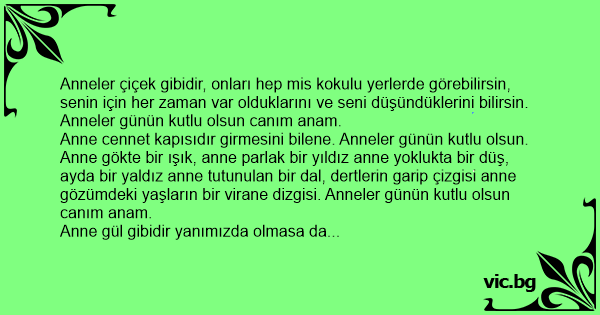 Canım Annem, benim senin varlığın her şeyiyle bana hayat veriyor. Senin o sıcacık sevgin vazgeçilmez sıcaklığın her zaman beni ısıttı, hep nerde zorda kalsam bana bir çıkar yolu buldun karanlıkta kaldığımda ay gibi parlayan ışığım, soğukta üşüdüğümde içimi sıcacık ısıtan sevginle her zaman yanımda oldun. iyiki varsın iyiki benim annemsin senin gibi annem olduğu için Allahıma sonsuz şükürler olsun seni çok seviyorum. Can özüm biricik anacığım, anneler gününü canı gönülden kutlarım, ellerinden öperim… Anneler Günün Kutlu Olsun.