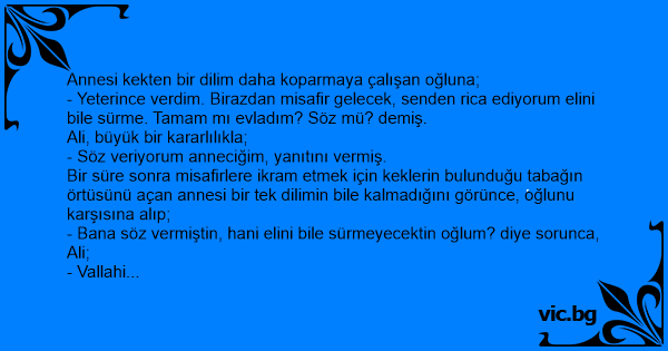 - Yeterince verdim. Birazdan misafir gelecek, senden rica ediyorum elini bile sürme. Tamam mı evladım? Söz mü? demiş.