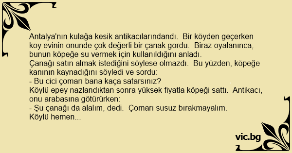 Köylü epey nazlandıktan sonra yüksek fiyatla köpeği sattı. Antikacı, onu arabasına götürürken: