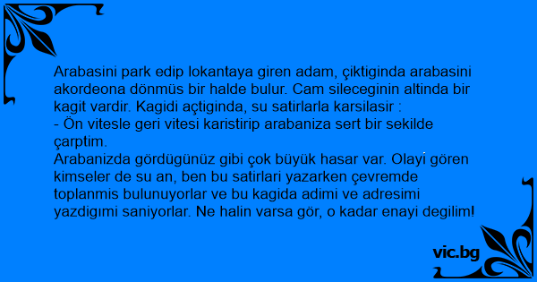 Arabasini park edip lokantaya giren adam, çiktiginda arabasini akordeona dönmüs bir halde bulur. Cam sileceginin altinda bir kagit vardir. Kagidi açtiginda, su satirlarla karsilasir :