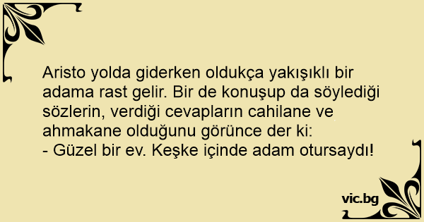 Aristo yolda giderken oldukça yakışıklı bir adama rast gelir. Bir de konuşup da söylediği sözlerin, verdiği cevapların cahilane ve ahmakane olduğunu görünce der ki: