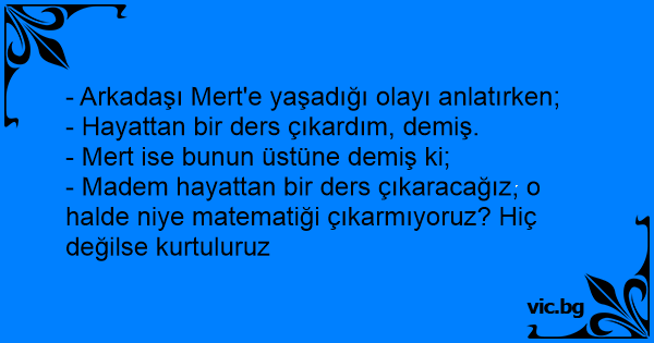 - Madem hayattan bir ders çıkaracağız, o halde niye matematiği çıkarmıyoruz? Hiç değilse kurtuluruz