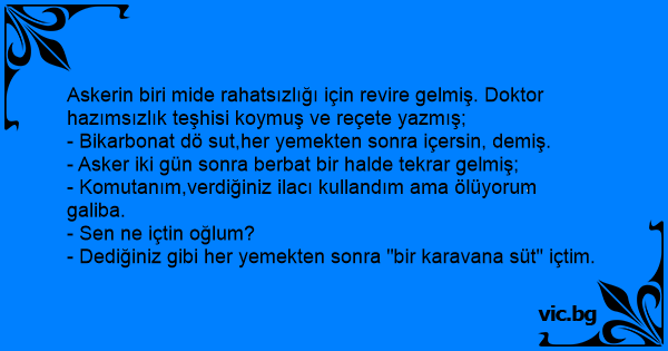 Askerin biri mide rahatsızlığı için revire gelmiş. Doktor hazımsızlık teşhisi koymuş ve reçete yazmış;