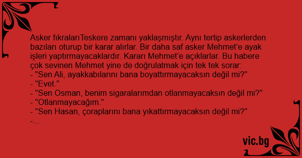 Asker fıkralarıTeskere zamanı yaklaşmıştır. Aynı tertip askerlerden bazıları oturup bir karar alırlar. Bir daha saf asker Mehmet’e ayak işleri yaptırmayacaklardır. Kararı Mehmet’e açıklarlar. Bu habere çok sevinen Mehmet yine de doğrulatmak için tek tek sorar: