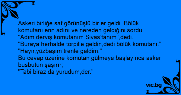 Bu cevap üzerine komutan gülmeye başlayınca asker büsbütün şaşırır;